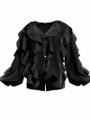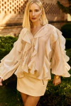 · Camisa com modelagem ampla e decote V. Possui manga comprida com detalhes de babados no comprimento. Sobreposição de babados, e fechamento com botões na parte frontal da peça.